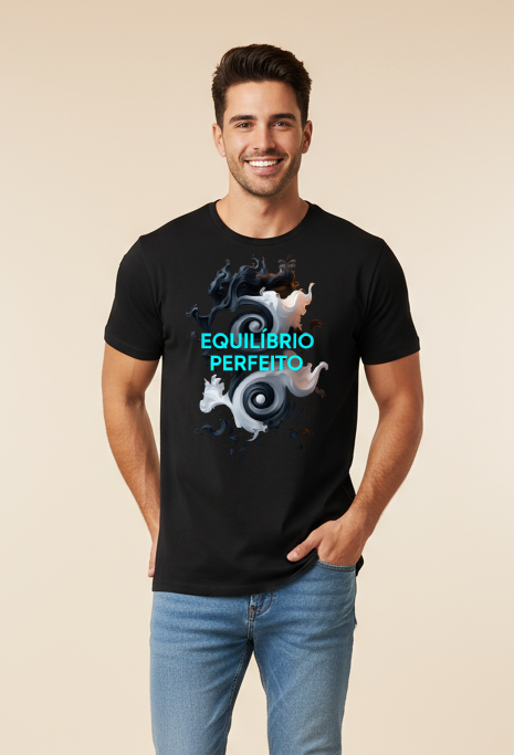Camiseta Tradicional, Gola Redonda, Casual com Estampa Equilíbrio Perfeito